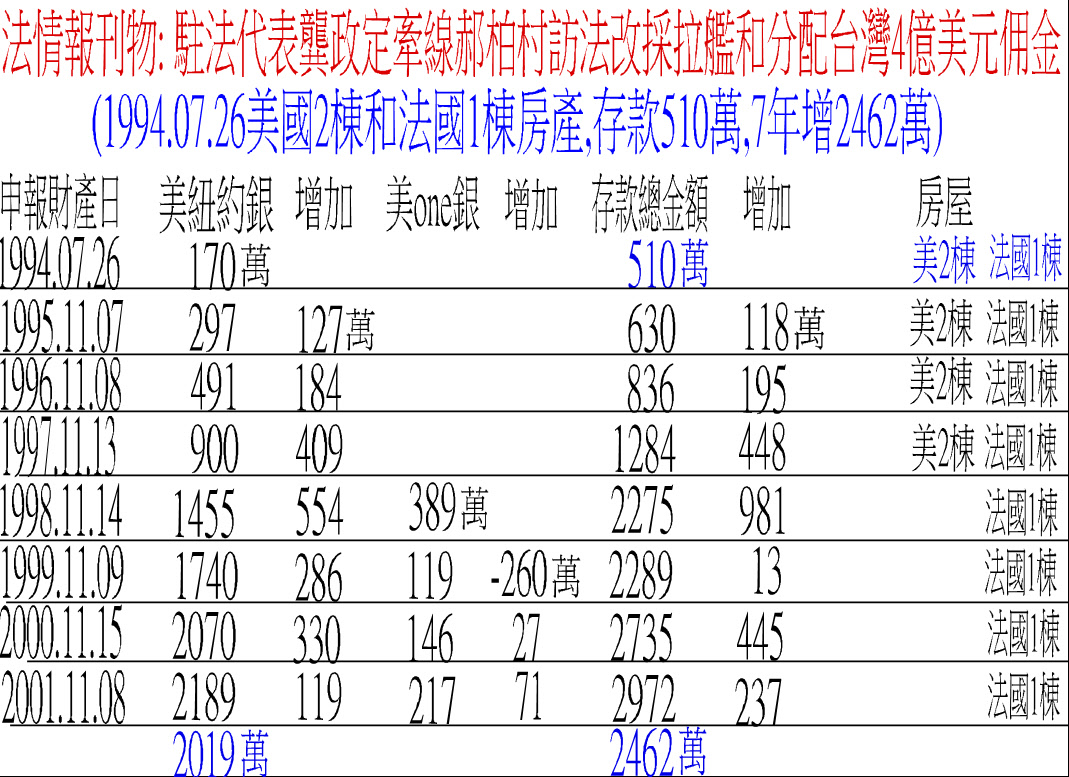 | 2002年4月法國情報刊物揭露: 1989年初,駐法代表龔政定牽線郝柏村訪法而改採拉 艦(郝柏村說: 龔政定聯繫法國8年買來)和龔負責分配台灣的四億美元佣金。 據1994年龔政定向監察院申報,房產美國2棟和法國1棟,存款510萬台幣,7年(1994年~2001年)存款增加兩千四百多萬台幣。我質疑來自拉艦佣金。 | |||||||
